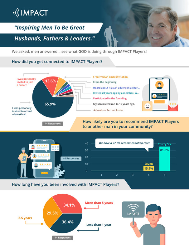 We believe that every man has the potential to bring life-changing impact in their marriage, family, business, community, and church. When a man is transformed from the inside out, the impact is limitless and eternal. IMPACT Players is for men who want to better - better men, better husbands, better fathers, better leaders. Whether you are a single man, newly married man, new dad, parent of a teen, divorced, remarried, grandfather, or widowed, you will find men's groups, leadership training, practical tools and more to help you thrive in the relationships that matter most.