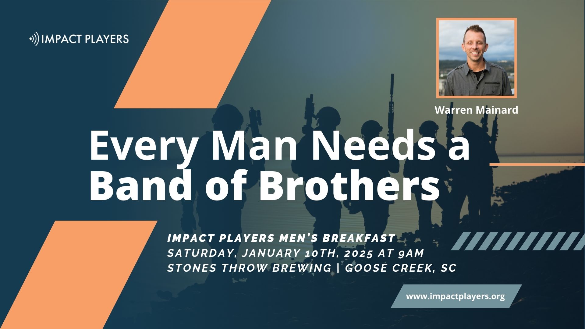 IMPACT Players National Director Warren Mainard will be speaking at the Charleston IMPACT Breakfast on January 10th at 9am on the importance of finding and developing a band of brothers. Isolation is a major problem for many men today. On the outside, everything looks pretty well put together, but internally, they are discouraged, overwhelmed, confused, and conflicted.
